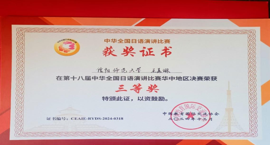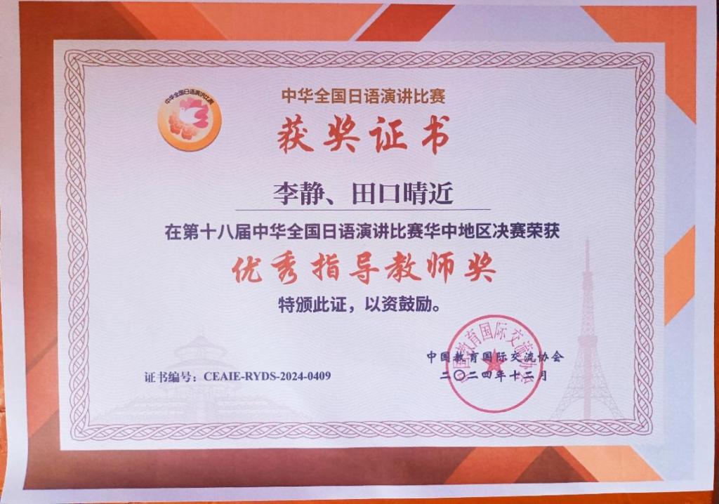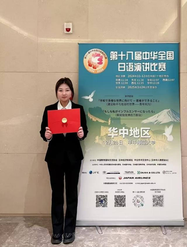 近日,第十八届中华全国日语演讲比赛华中赛区决赛在华中师范大学隆重落下帷幕,公司日语专业2022级王美琳同学在李静老师和田口晴近老师的指导下荣获华中赛区决赛三等奖。