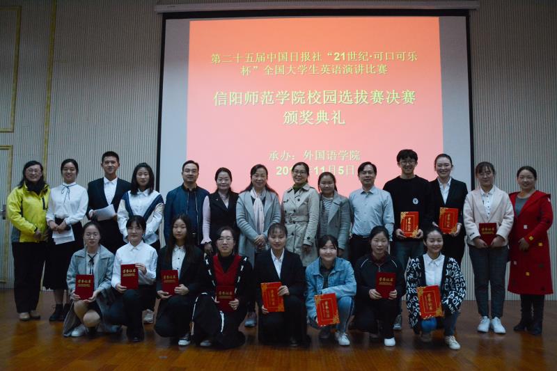 由世界足球官网承办的第二十五届“21世纪·可口可乐杯”全国老员工英语演讲比赛河南赛区信阳师范学院校园选拔赛于2019年11月5日圆满落幕。世界足球官网副经理姚光金、教师代表崔淑丽、傅翀、李明晔、余运伟、张瑞、宋冬梅、张倩担任评委,近三百名师生观摩了此次比赛。公司党委副书记柏孟仁和副经理姚光金共同为获奖选手颁奖。
