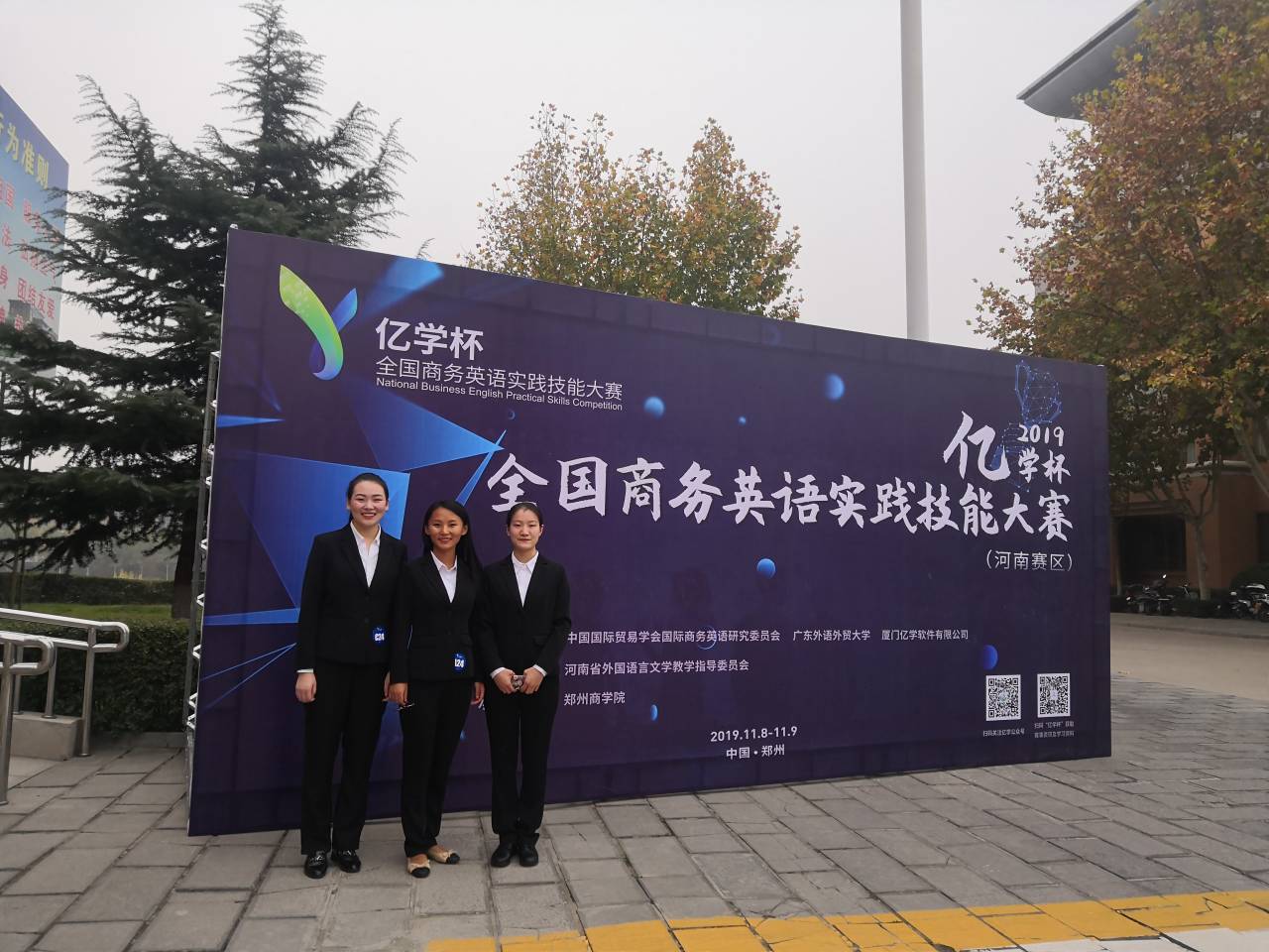 11月8日至9日,“亿学杯”全国商务英语实践技能大赛河南赛区决赛在郑州商学院成功举办,来自省内24所本科院校的参赛队伍同台竞技。经过激烈角逐,公司由张瑞、杨慧芳老师指导,冯雨萌、赵聪、李新月同学组成的代表队荣获一等奖。