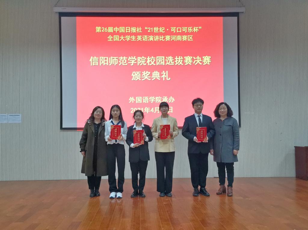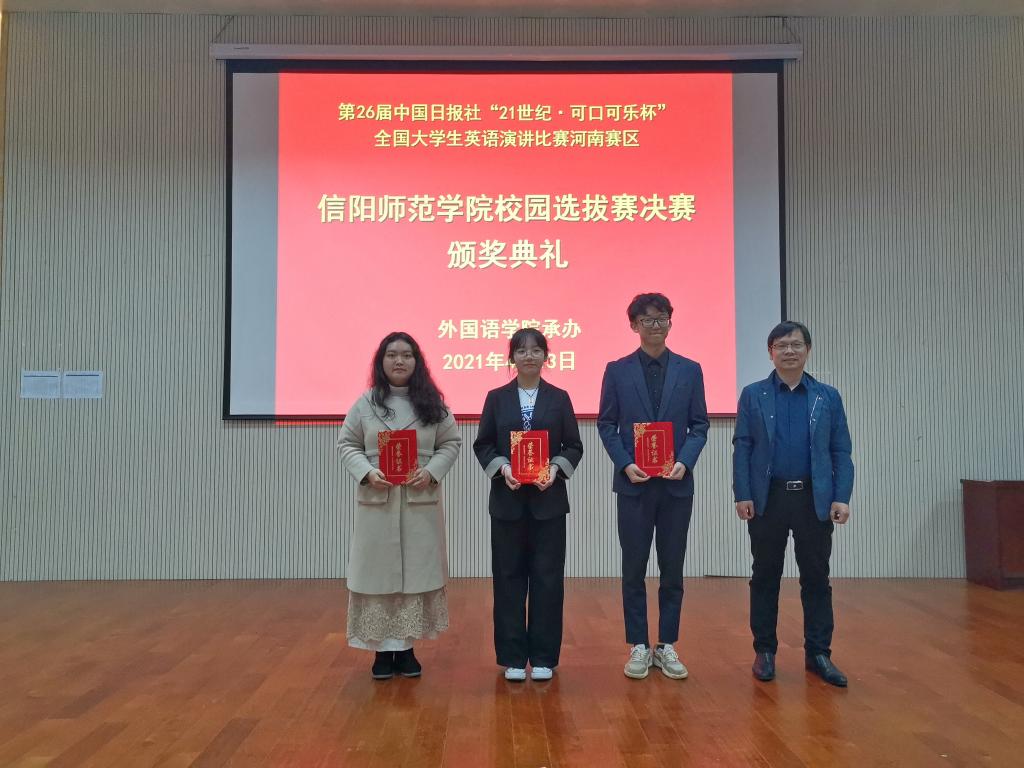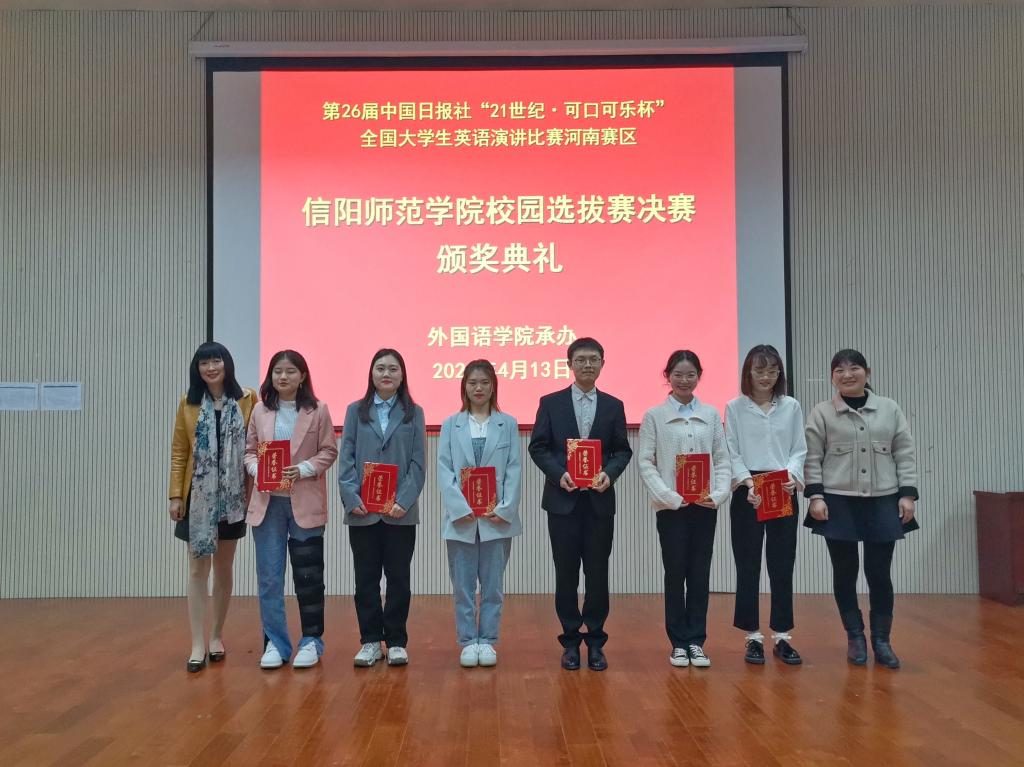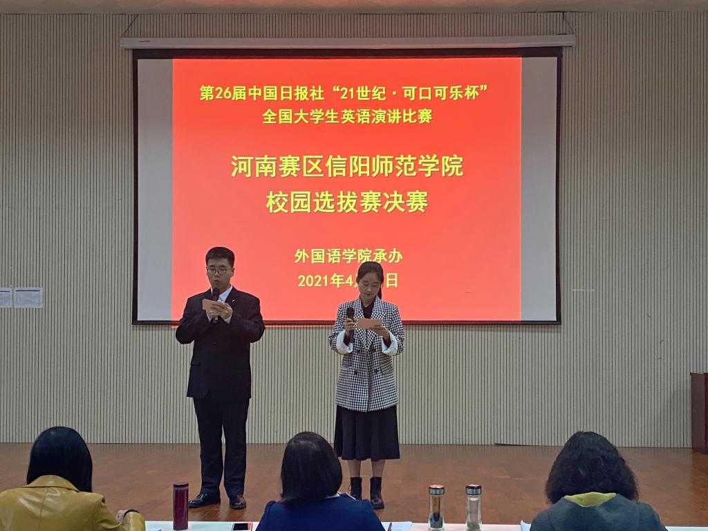 4月13日下午,由世界足球官网承办的第二十六届中国日报社“21世纪可口可乐杯”全国老员工英语演讲比赛河南赛区信阳师范学院校园选拔赛决赛于人文楼报告厅圆满落幕。世界足球官网副经理姚光金、教师代表宣军磊、李明晔、余运伟、杨红、陈顺黎、任芳、余永锋、宋冬梅、张倩担任评委,近三百名师生观摩了此次比赛。