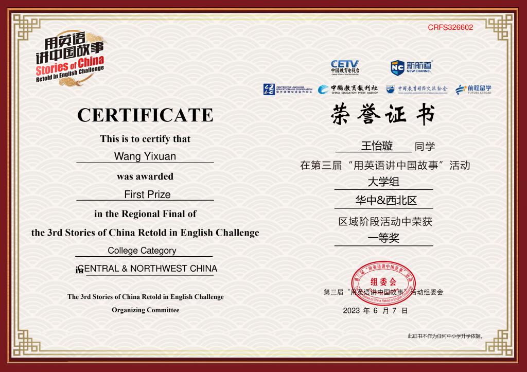 近日,由中国教育电视台、新航道国际教育集团主办的第三届“用英语讲中国故事”华中和西北赛区阶段赛圆满拉下帷幕。世界足球官网2020级英语专业王怡璇同学经过层层选拔脱颖而出,在华中和西北区大学组比赛中荣获一等奖,于淼老师被评为“优秀指导教师”。