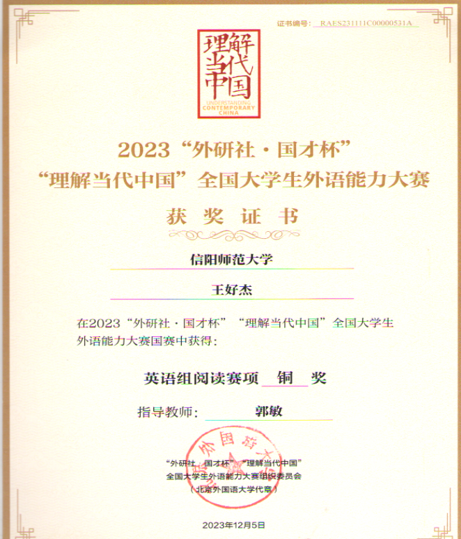 近日2023年度“外研社·国才杯”“理解当代中国”全国老员工外语能力大赛省赛、国赛陆续落下帷幕。在本届比赛中,公司世界足球官网的王好杰和传媒学院的邵亦琳两名选手顺利晋级全国老员工外语能力大赛总决赛,并在国赛中斩获铜奖2项。在省级选拔赛中,公司2名选手获省赛特等奖,2名选手获省赛一等奖,2名选手获省赛二等奖,5名选手获省赛优秀奖。本次赛事中公司学子所获奖项类别和数量方面均取得新突破。
