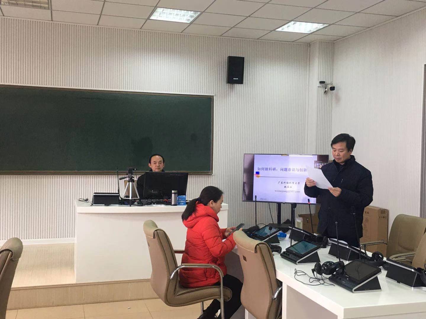 12月28日下午,魏在江在人文楼505教室作了题为“如何做科研:问题意识与创新意识”的学术报告。经理蔡满园主持报告会,学院部分教师和全体研究生共同聆听了报告。魏在江结合当前外语教学与研究的实际,围绕中国学术的独立思考及构建本土化的语言学理论、中国优秀文化如何走出去、外语研究方法论、如何正确处理教学与科研的关系等方面的话题展开论述,并结合自己的科研经历指导青年教师和研究生如何科学选择研究主题。