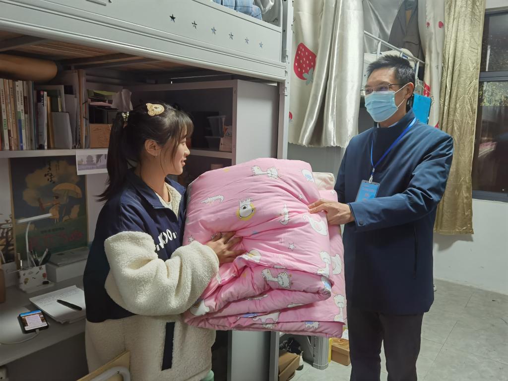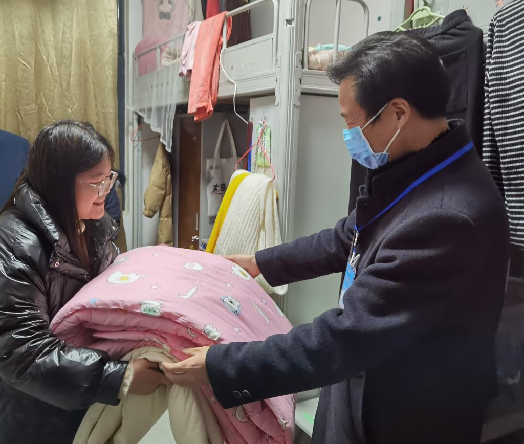 走访过程中,陈铭一行与同学们亲切交谈,深入了解他们的学习、生活情况,提醒员工注意防寒保暖,并亲手将爱心棉被送到贫困生手中。陈铭认真听取了员工生活和学习中遇到的问题、困难,勉励员工勇于弘毅与坚持、乐于感恩和奉献、敢于负责有担当,以才智振兴民族、以爱心回报社会,做一名合格的新时代有志青年。蔡满园叮嘱员工们及时添衣加被,注意冬季用电安全,以健康的体魄投入到接下来的学习任务中,鼓励大家勤于思考,练就本领,全面提升自身的综合素质。同学们深受感动,纷纷表示一定会刻苦学习,以实际行动回报学校和社会。