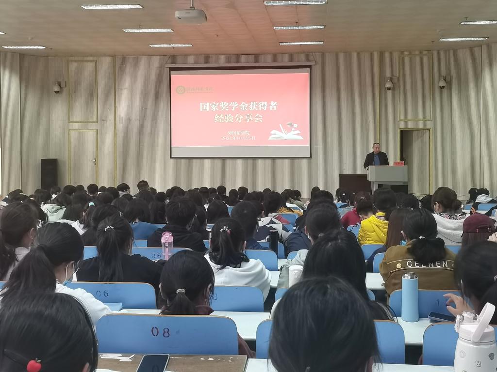 10月25日,世界足球官网在人文楼报告厅举行国家奖学金获得者经验交流分享会,党委副书记高彦伟、资助专员孙桢桢、2021年国家奖学金获得者以及2021级全体员工参加了分享会,会议由孙桢桢主持。