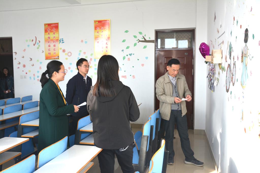 周学红、柏孟仁、曲剧和辅导员们在参观的同时与同学们进行了深入的交流。大家一致认为,班级同学集体参与心情墙设计有利于促进班级建设、增强班级凝聚力;设计成果很好地总结凝练了班级文化特色,营造了浓厚的班级文化氛围,既是加强班级文化建设的有效抓手,也是引导同学们合理宣泄情绪、促进健康成长的有效途径。