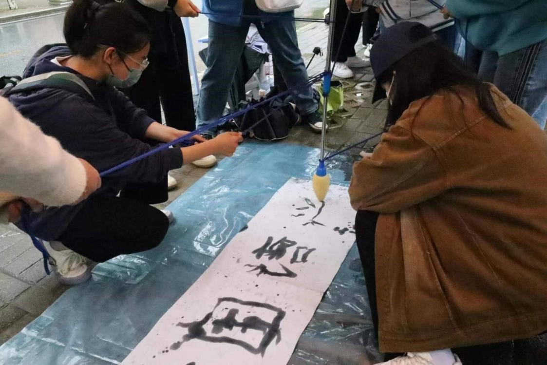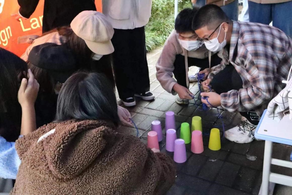 此次心理游园会以“不负韶华,出彩青春”为主题,包括“妙笔生花”和“加‘杯’快乐”两项活动。“妙笔生花”为五人团队游戏,挑战任务分为三个不同难度等级,要求团队成员依据所选难度等级,借助拉绳,从不同方向牵引一支大毛笔书写单词、成语、创作简笔画等。“加‘杯’快乐”为两人合作游戏,成员需齐心协力用手控制绳子,再用绳子锁住杯子,先将同色杯子套在一起,最后将所有杯子套在一起。
