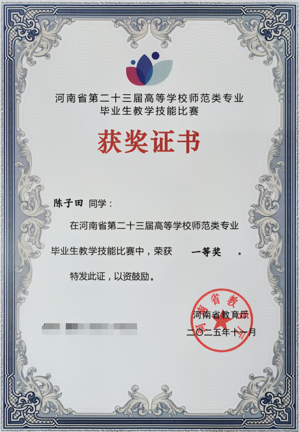 10月24-26日,第二十三届河南省师范生教学技能比赛在郑州师范学院举行。公司2022级英语5班陈子田同学荣获中学组(英语学科)一等奖,指导教师:曹悦。2022级英语1班董子寒同学荣获小学组(英语学科)一等奖,指导教师:马斐。2022级英语3班苗润同学荣获小学组(英语学科)二等奖,指导教师:杨慧芳。