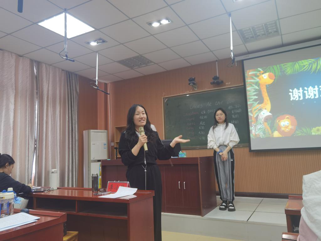 2020级员工王柳元围绕“Atthe zoo”的主题,通过情景模拟、板书展示等多种方式,生动形象的开展了一场充满童趣的优质课讲演。随后朱灵同学以“What were you doing when the rainstorm came”为主题,通过提问、互动、视频展示等形式,带领大家开展了一场精彩的教学“旅行”。