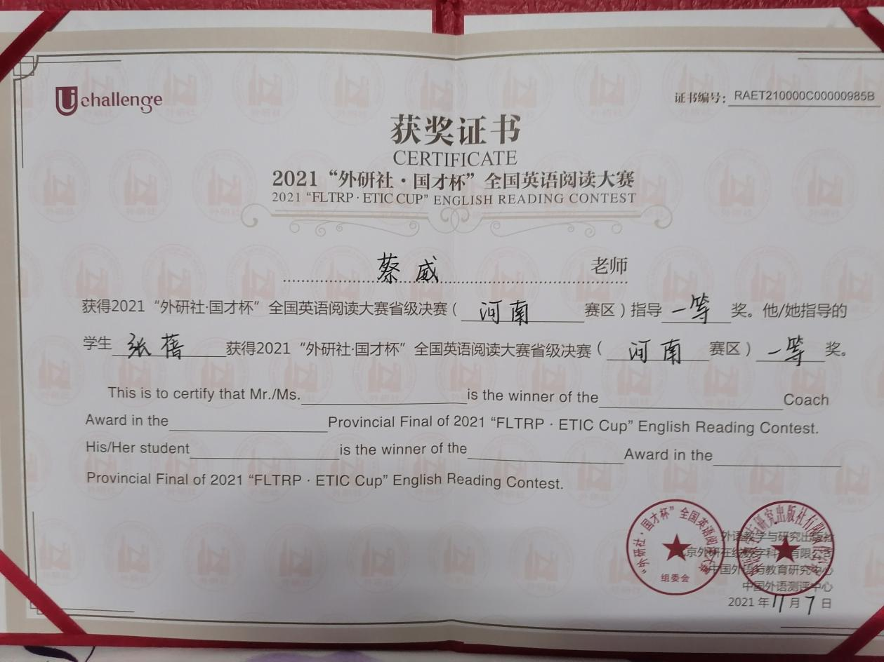 当下,由蔡威副教授指导的员工收到2021年“外研社 国才杯”全国英语阅读大赛,获得河南赛区一等奖。