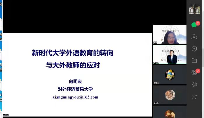 向明友教授主讲新时代大学外语教育的转向与大外教师的应对;卢志鸿教授主讲师业载道,言以足志——外语教学中如何有效提高员工综合素养、讲好中国故事;王金铨教授主讲一流课程建设与思政教育融入的思考与实践 ;陶友兰教授主讲语言能力与翻译能力发展之关系 ;王宇教授主讲新形势下外语教材建设如何做好学科创新、思维创新与教学创新——打造多维度立体化创新型商务英语教材。