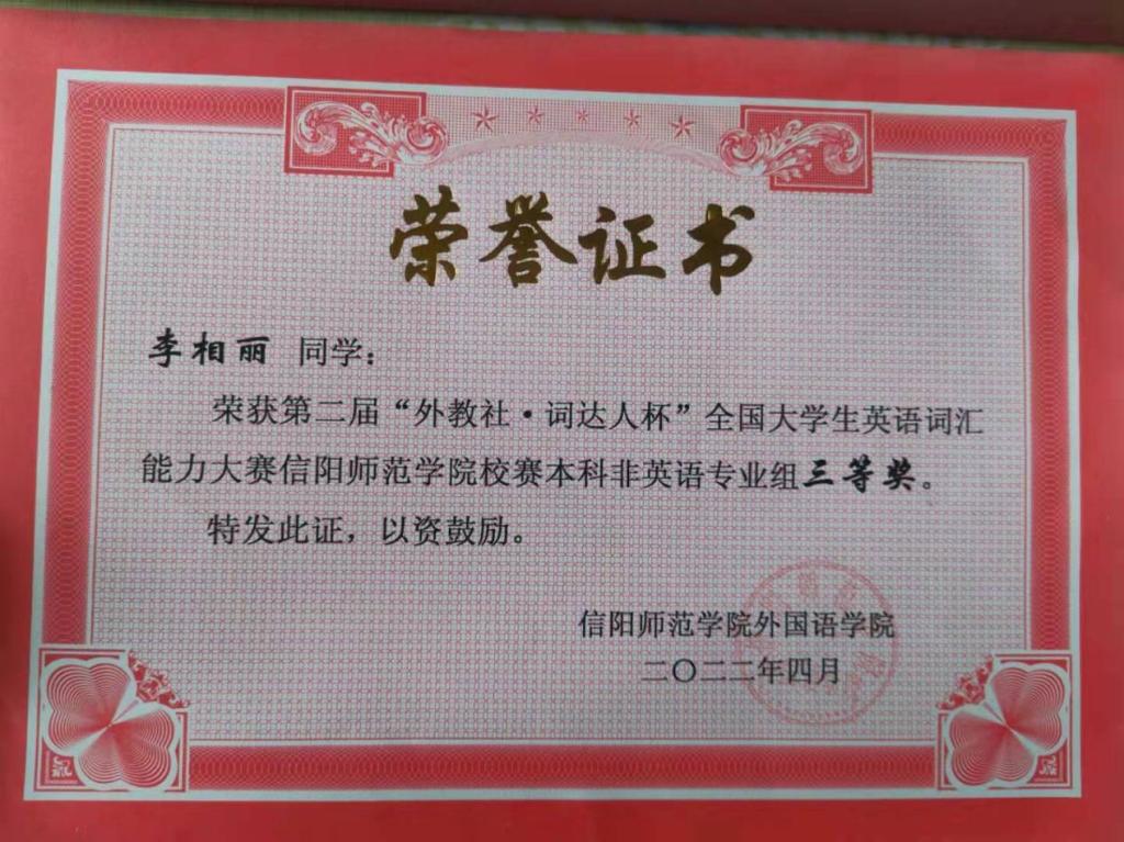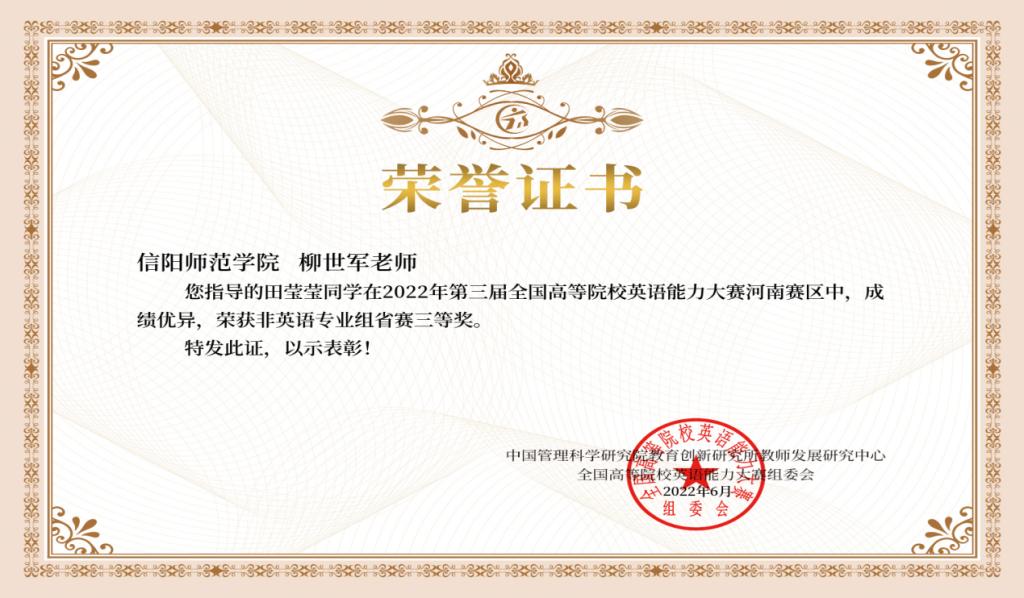五、此前,由蔡威副教授指导的员工收到2021年“外研社 国才杯”全国英语阅读大赛,获得河南赛区一等奖,证书如下: