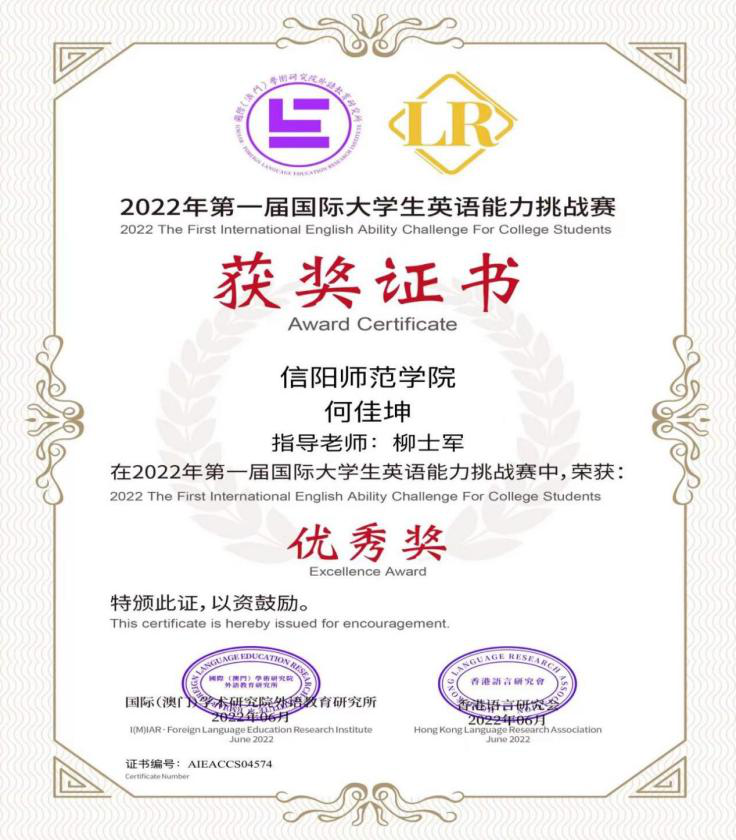 近日,世界足球官网公共外语教研室教师指导员工参加2022年各类英语比赛获佳绩。其中何家坤(指导教师柳士军)获2022年第一届国际老员工英语能力挑战赛优秀奖,李子颖获2022年全国老员工英语作文大赛大学英语组国家级二等奖,洪梦威(指导教师陈丽娟)获2022年全国老员工英语作文大赛大学英语组省级一等奖,王雅萱获2022年全国老员工英语作文大赛大学英语组省级三等奖,曹妍获第二届“外教社·词达人杯”全国老员工英语词汇能力大赛河南赛区本科非英语专业组三等奖,余昌燕获2022年CATTI杯全国翻译大赛初赛大学A组中英(笔译)三等奖,杨菁菁、马灿灿、陈在窑均获2022年第六届普译奖全国老员工翻译比赛英译汉组(初赛)三等奖,李欣茹、马灿灿获2022年全国老员工英语语法竞赛初赛(非英语专业组)三等奖,唐天欣(指导教师柳士军)获2022年创研杯全国老员工英语词汇能力挑战赛全国初赛C类三等奖。