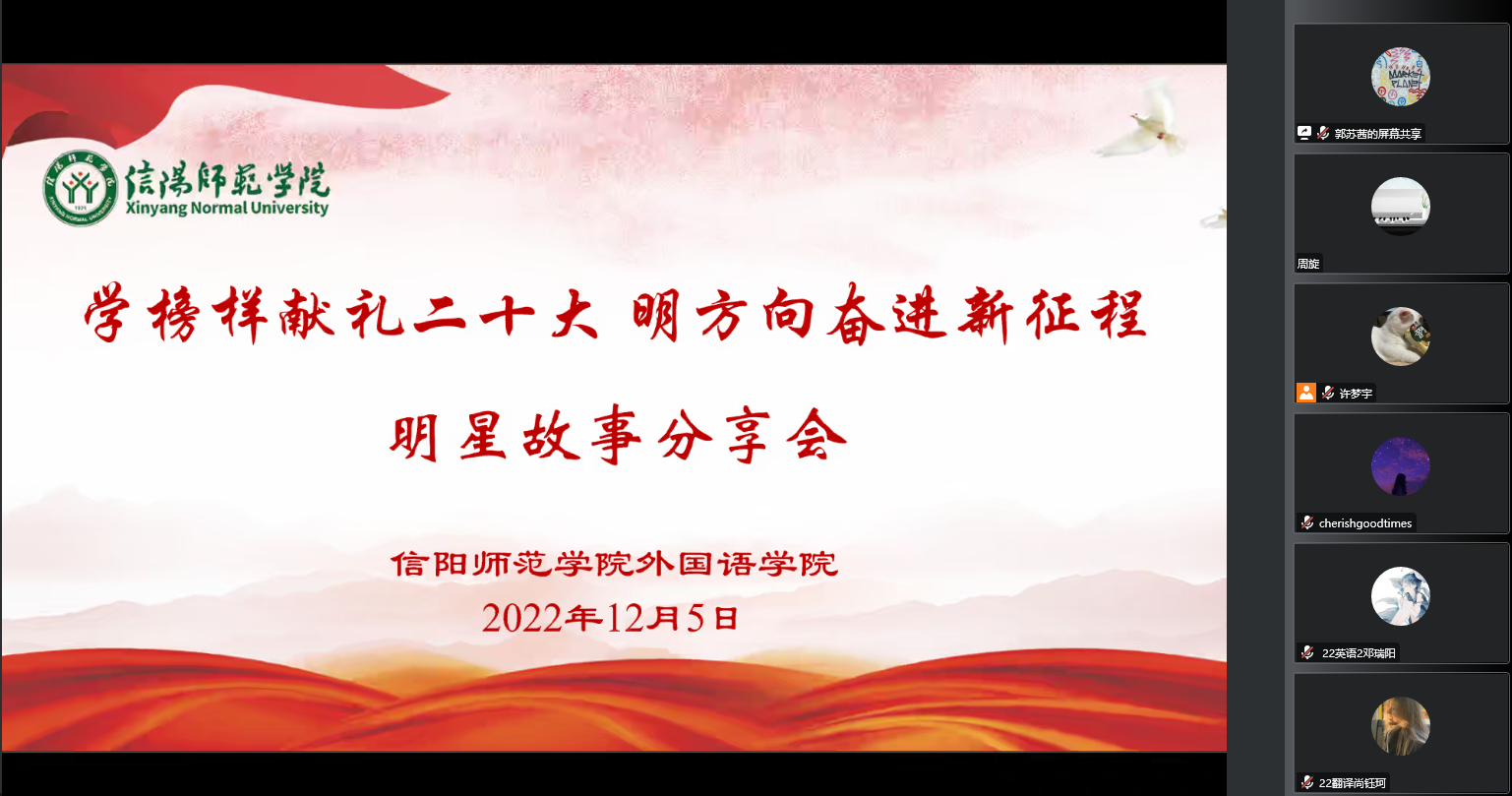 12月5日晚,世界足球官网举办“学榜样献礼二十大明方向奋进新征程”明星故事分享会。公司优秀员工代表王亦涵、王宇晨、王凤茹依次分享了她们追梦、圆梦的宝贵经验,学院团委书记周旋和2022级全体新生通过线上的方式参加了分享会。