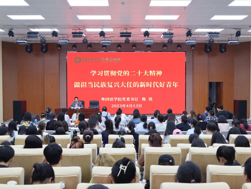 陈铭结合自身经历勉励师生:一是立志养德,做对党忠诚、旗帜鲜明的有志青年。紧跟时代步伐,高举中国特色社会主义伟大旗帜,以习近平新时代中国特色社会主义思想为指导,深入学习贯彻党的二十大精神,将国家和民族的重任与个人的发展、人生的升华融为一体,响应祖国的期盼和召唤,为祖国建功立业。二是博学明知,做文质彬彬、专业过硬的有知青年。深刻认识肩负的光荣使命和历史责任,以精进的态度求学问、以不倦的精神探新知,精通专业语言,学贯东西之文,用真才实学来加强知识储备、技能储备和本领储备,做新一代有着良好人文素养、富于创造精神和具有多学科知识基础的“通才”型外语人才。三是敦行奋发,做传衍薪火、勇挑重任的有为青年。做不尚空谈、不慕浮华的行动派,以永不懈怠的追求、只争朝夕的精神、不断超越的气魄,在实现中华民族伟大复兴的时代洪流中勇毅前进,实现自身价值,绽放青春之花。