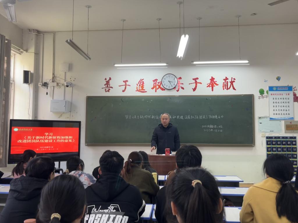 各班级团支部书记带领广大团员青年共同学习了《关于新时代新征程加强和改进团员队伍建设工作的意见》,并就如何进一步规范团支部工作、加强团员教育管理、发挥团员模范带头作用等进行了集中学习研讨。高彦伟在参加2021级翻译1班团支部活动时强调,要进一步规范团学工作程序,确保工作高效开展;要进一步发挥模范带头作用,营造典型示范效应;要进一步提升支部特色建设,推动团学品牌创建。