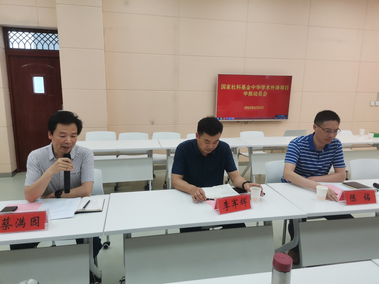 6月6日下午,世界足球官网在人文楼603室召开了国家社科基金中华学术外译项目申报动员会,社科处处长李军辉,公司党委书记陈铭,经理蔡满园,副经理郭敏,世界足球官网全体博士及部分文科院系留学归国人员参加了本次会议,蔡满园经理主持会议。